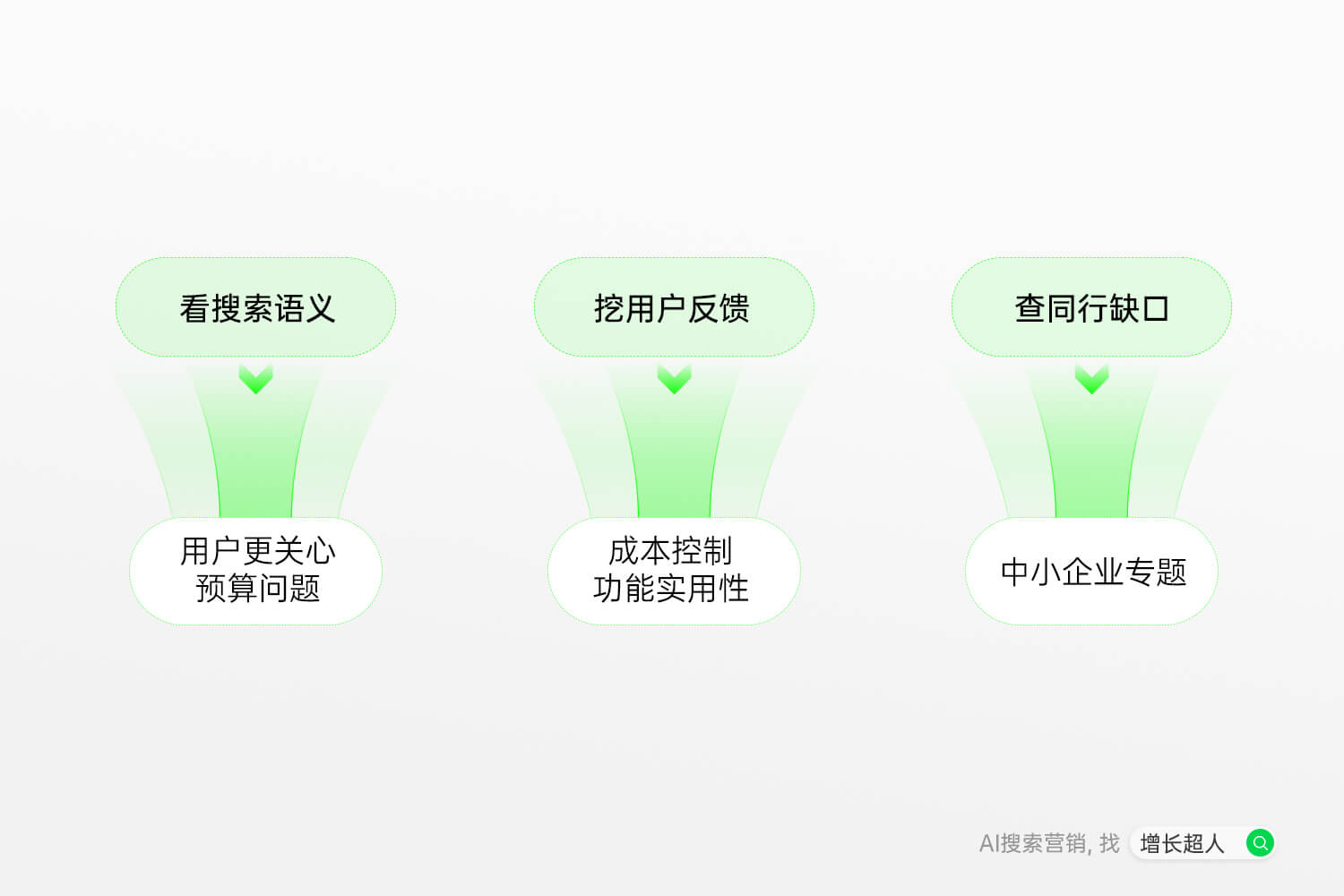 想讓 AI 主動推薦你的內(nèi)容,核心前提是精準(zhǔn)捕捉用戶的真實(shí)需求 —— 而需求從不是憑空猜測的,而是藏在用戶的每一句碎片表達(dá)里,這需要我們搭建一套科學(xué)的 “需求洞察體系”,把隱性痛點(diǎn)轉(zhuǎn)化為明確的破局方向。我們可以靠這三個維度來挖掘用戶需求:
