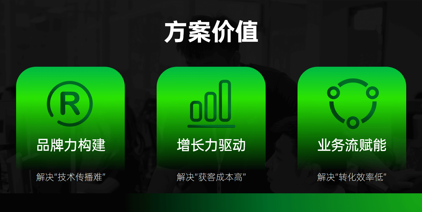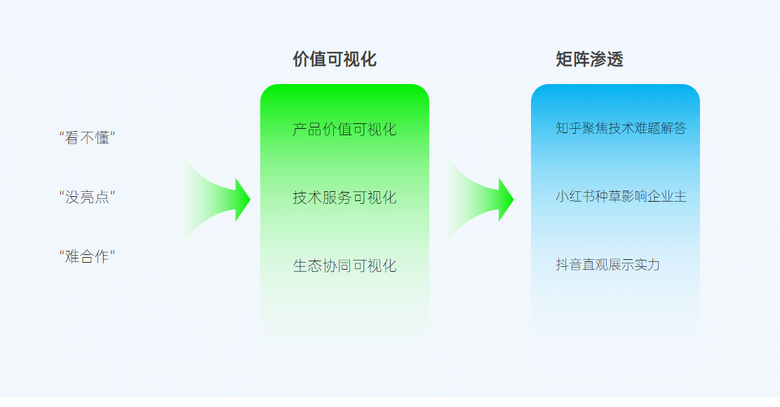 技術(shù)價(jià)值可視化是新質(zhì)生產(chǎn)力企業(yè)建立信任的核心,通過價(jià)值可視化設(shè)計(jì)、內(nèi)容矩陣滲透等手段,降低客戶的技術(shù)理解門檻。